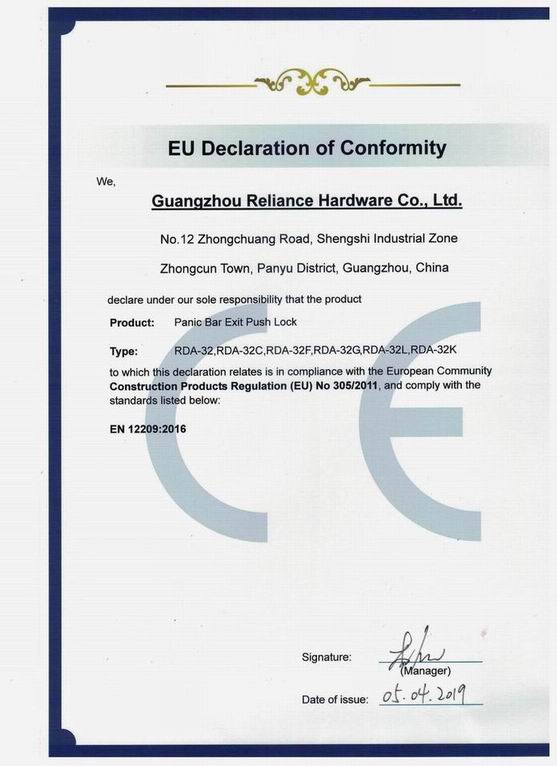 CERTIFICATE Of Panic Bar Exit Push Lock